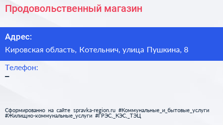 Продовольственный магазин по адресу Кировская область, Котельнич, улица Пушкина, 8 в дальнейшем Организация, размещена в следующих категориях: