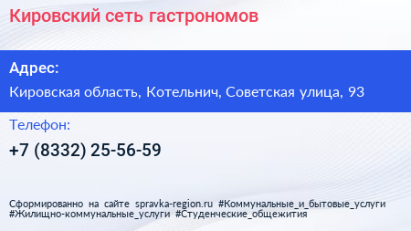 Кировский, сеть гастрономов по адресу Кировская область, Котельнич, Советская улица, 93 в дальнейшем Организация, размещена в следующих категориях:
