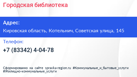 Городская библиотека по адресу Кировская область, Котельнич, Советская улица, 145 в дальнейшем Организация, размещена в следующих категориях: