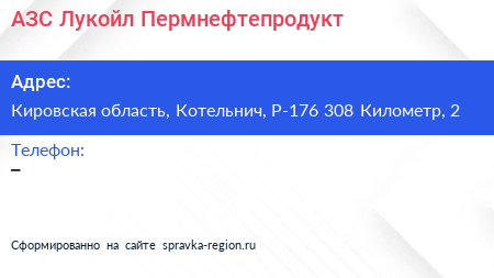 АЗС, Лукойл-Пермнефтепродукт по адресу Кировская область, Котельнич, Р-176 308 Километр, 2 в дальнейшем Организация, размещена в следующих категориях: