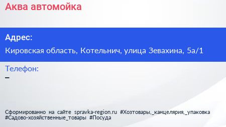 Аква, автомойка по адресу Кировская область, Котельнич, улица Зевахина, 5а/1 в дальнейшем Организация, размещена в следующих категориях: