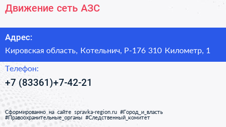 Движение, сеть АЗС по адресу Кировская область, Котельнич, Р-176 310 Километр, 1 в дальнейшем Организация, размещена в следующих категориях: