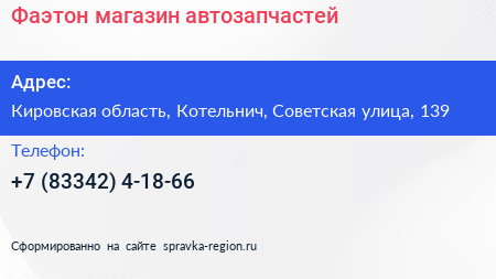 Фаэтон, магазин автозапчастей по адресу Кировская область, Котельнич, Советская улица, 139 в дальнейшем Организация, размещена в следующих категориях: