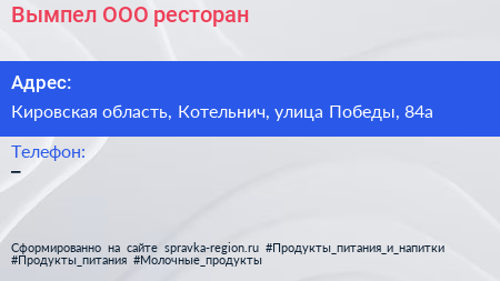 Вымпел, ООО, ресторан по адресу Кировская область, Котельнич, улица Победы, 84а в дальнейшем Организация, размещена в следующих категориях: