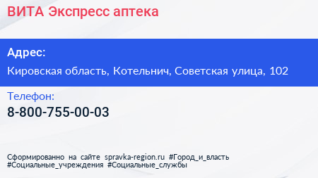 ВИТА Экспресс, аптека по адресу Кировская область, Котельнич, Советская улица, 102 в дальнейшем Организация, размещена в следующих категориях: