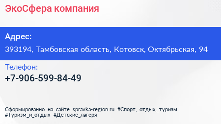 ЭкоСфера, компания по адресу 393194, Тамбовская область, Котовск, Октябрьская, 94 в дальнейшем Организация, размещена в следующих категориях: