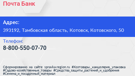Почта Банк по адресу 393192, Тамбовская область, Котовск, Котовского, 50 в дальнейшем Организация, размещена в следующих категориях: