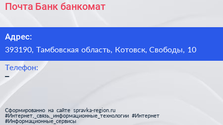 Почта Банк, банкомат по адресу 393190, Тамбовская область, Котовск, Свободы, 10 в дальнейшем Организация, размещена в следующих категориях: