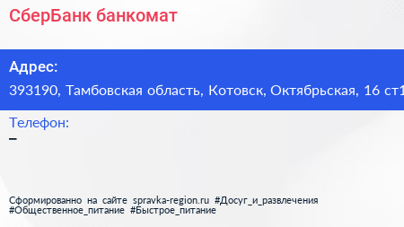 СберБанк, банкомат по адресу 393190, Тамбовская область, Котовск, Октябрьская, 16 ст1 в дальнейшем Организация, размещена в следующих категориях: