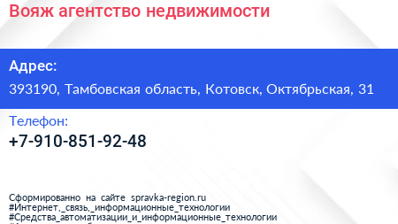 Вояж, агентство недвижимости по адресу 393190, Тамбовская область, Котовск, Октябрьская, 31 в дальнейшем Организация, размещена в следующих категориях: