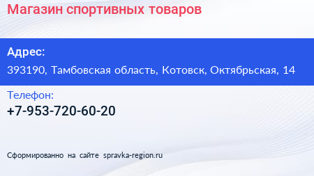 Магазин спортивных товаров по адресу 393190, Тамбовская область, Котовск, Октябрьская, 14 в дальнейшем Организация, размещена в следующих категориях:
