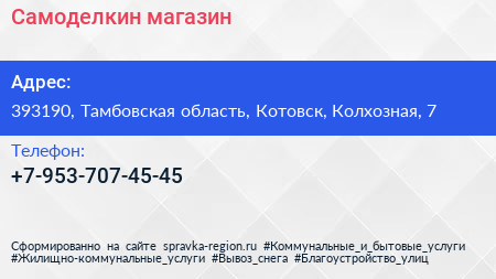 Самоделкин, магазин по адресу 393190, Тамбовская область, Котовск, Колхозная, 7 в дальнейшем Организация, размещена в следующих категориях: