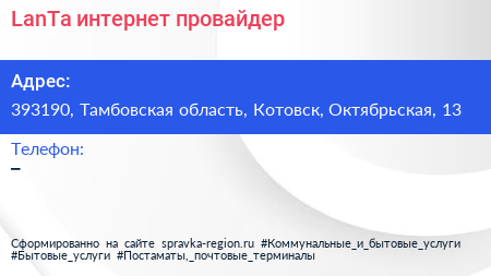 LanTa, интернет-провайдер по адресу 393190, Тамбовская область, Котовск, Октябрьская, 13 в дальнейшем Организация, размещена в следующих категориях: