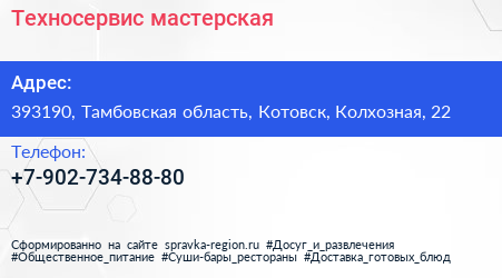Техносервис, мастерская по адресу 393190, Тамбовская область, Котовск, Колхозная, 22 в дальнейшем Организация, размещена в следующих категориях: