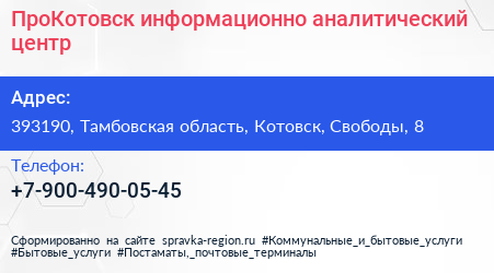 ПроКотовск, информационно-аналитический центр по адресу 393190, Тамбовская область, Котовск, Свободы, 8 в дальнейшем Организация, размещена в следующих категориях: