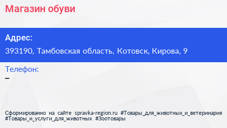 Магазин обуви по адресу 393190, Тамбовская область, Котовск, Кирова, 9 в дальнейшем Организация, размещена в следующих категориях: