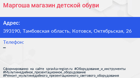 Маргоша, магазин детской обуви по адресу 393190, Тамбовская область, Котовск, Октябрьская, 26 в дальнейшем Организация, размещена в следующих категориях: