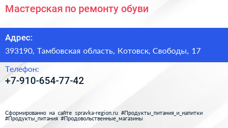 Мастерская по ремонту обуви по адресу 393190, Тамбовская область, Котовск, Свободы, 17 в дальнейшем Организация, размещена в следующих категориях: