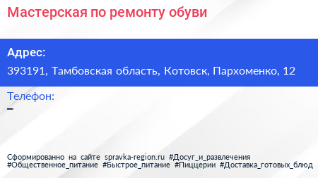 Мастерская по ремонту обуви по адресу 393191, Тамбовская область, Котовск, Пархоменко, 12 в дальнейшем Организация, размещена в следующих категориях: