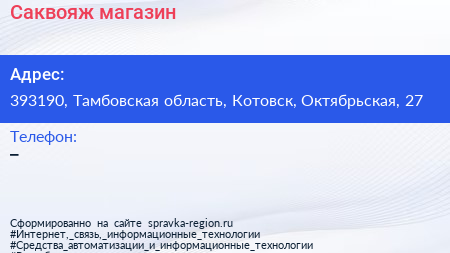 Саквояж, магазин по адресу 393190, Тамбовская область, Котовск, Октябрьская, 27 в дальнейшем Организация, размещена в следующих категориях: