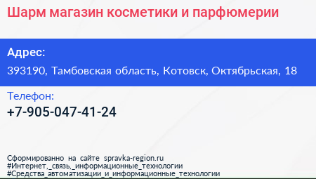 Шарм, магазин косметики и парфюмерии по адресу 393190, Тамбовская область, Котовск, Октябрьская, 18 в дальнейшем Организация, размещена в следующих категориях: