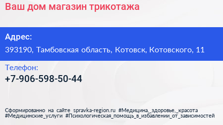 Ваш дом, магазин трикотажа по адресу 393190, Тамбовская область, Котовск, Котовского, 11 в дальнейшем Организация, размещена в следующих категориях: