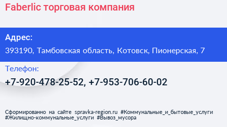 Faberlic, торговая компания по адресу 393190, Тамбовская область, Котовск, Пионерская, 7 в дальнейшем Организация, размещена в следующих категориях: