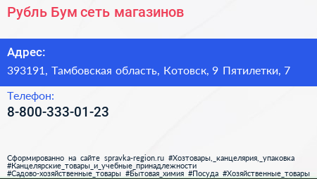 Рубль Бум, сеть магазинов по адресу 393191, Тамбовская область, Котовск, 9 Пятилетки, 7 в дальнейшем Организация, размещена в следующих категориях:
