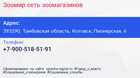 Зоомир, сеть зоомагазинов по адресу 393190, Тамбовская область, Котовск, Пионерская, 6 в дальнейшем Организация, размещена в следующих категориях: