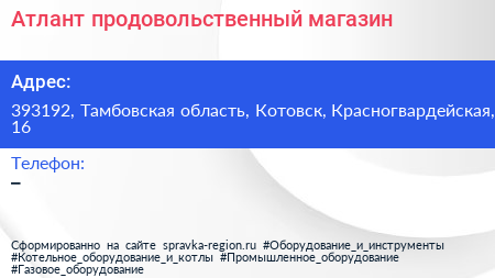 Атлант, продовольственный магазин по адресу 393192, Тамбовская область, Котовск, Красногвардейская, 16 в дальнейшем Организация, размещена в следующих категориях: