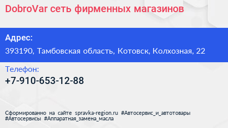 DobroVar, сеть фирменных магазинов по адресу 393190, Тамбовская область, Котовск, Колхозная, 22 в дальнейшем Организация, размещена в следующих категориях: