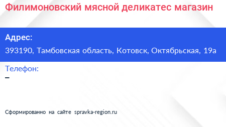Филимоновский мясной деликатес, магазин по адресу 393190, Тамбовская область, Котовск, Октябрьская, 19а в дальнейшем Организация, размещена в следующих категориях: