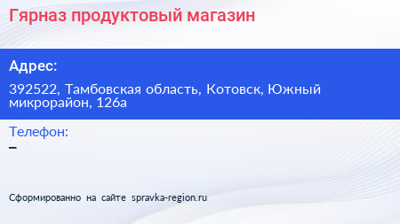 Гярназ, продуктовый магазин по адресу 392522, Тамбовская область, Котовск, Южный микрорайон, 126а в дальнейшем Организация, размещена в следующих категориях: