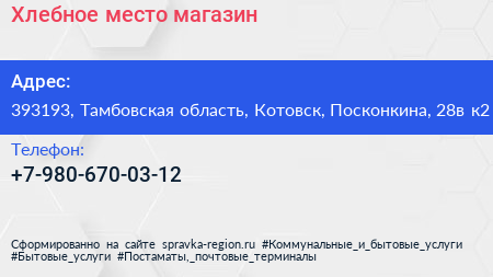 Хлебное место, магазин по адресу 393193, Тамбовская область, Котовск, Посконкина, 28в к2 в дальнейшем Организация, размещена в следующих категориях: