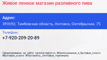 Живое пенное, магазин разливного пива по адресу 393192, Тамбовская область, Котовск, Октябрьская, 75 в дальнейшем Организация, размещена в следующих категориях: