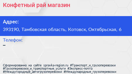 Конфетный рай, магазин по адресу 393190, Тамбовская область, Котовск, Октябрьская, 6 в дальнейшем Организация, размещена в следующих категориях: