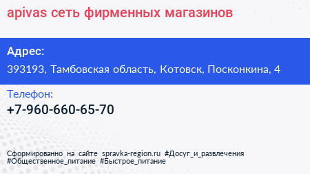 apivas, сеть фирменных магазинов по адресу 393193, Тамбовская область, Котовск, Посконкина, 4 в дальнейшем Организация, размещена в следующих категориях: