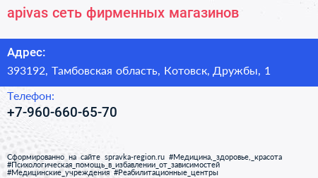 apivas, сеть фирменных магазинов по адресу 393192, Тамбовская область, Котовск, Дружбы, 1 в дальнейшем Организация, размещена в следующих категориях: