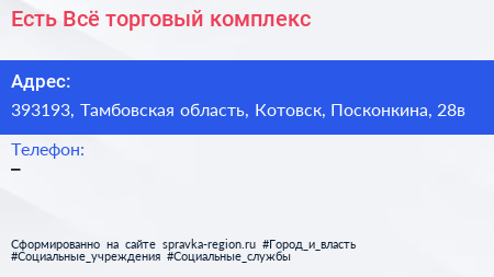 Есть Всё, торговый комплекс по адресу 393193, Тамбовская область, Котовск, Посконкина, 28в в дальнейшем Организация, размещена в следующих категориях: