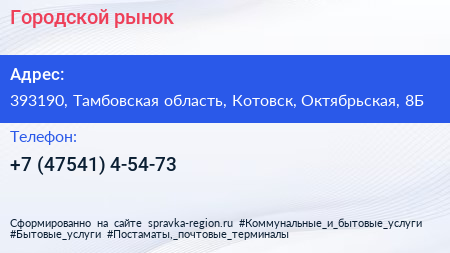Городской рынок по адресу 393190, Тамбовская область, Котовск, Октябрьская, 8Б в дальнейшем Организация, размещена в следующих категориях:
