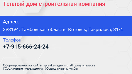 Теплый дом, строительная компания по адресу 393194, Тамбовская область, Котовск, Гаврилова, 31/1 в дальнейшем Организация, размещена в следующих категориях: