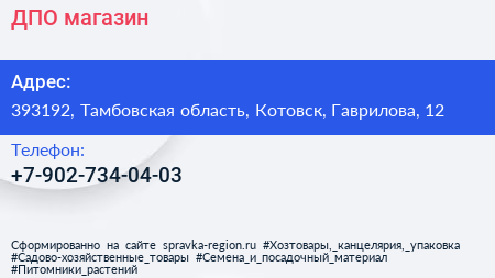 ДПО, магазин по адресу 393192, Тамбовская область, Котовск, Гаврилова, 12 в дальнейшем Организация, размещена в следующих категориях: