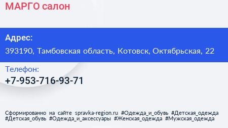 МАРГО, салон по адресу 393190, Тамбовская область, Котовск, Октябрьская, 22 в дальнейшем Организация, размещена в следующих категориях: