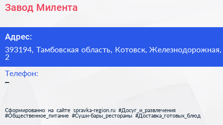 Завод Милента по адресу 393194, Тамбовская область, Котовск, Железнодорожная, 2 в дальнейшем Организация, размещена в следующих категориях: