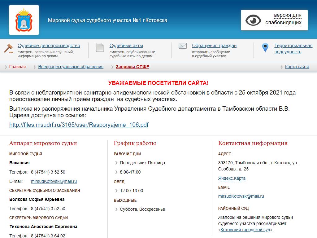 Мировые судьи г. Котовска по адресу 393191, Тамбовская область, Котовск, Свободы, 25 в дальнейшем Организация, размещена в следующих категориях: