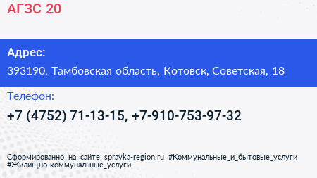 АГЗС№20 по адресу 393190, Тамбовская область, Котовск, Советская, 18 в дальнейшем Организация, размещена в следующих категориях: