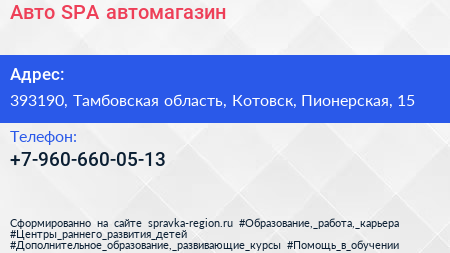 Авто SPA, автомагазин по адресу 393190, Тамбовская область, Котовск, Пионерская, 15 в дальнейшем Организация, размещена в следующих категориях: