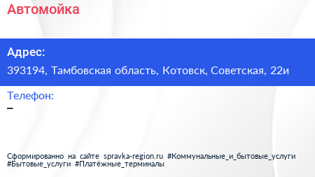 Автомойка по адресу 393194, Тамбовская область, Котовск, Советская, 22и в дальнейшем Организация, размещена в следующих категориях: