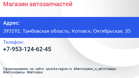 Магазин автозапчастей по адресу 393192, Тамбовская область, Котовск, Октябрьская, 35 в дальнейшем Организация, размещена в следующих категориях:
