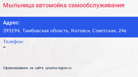 Мыльница, автомойка самообслуживания по адресу 393194, Тамбовская область, Котовск, Советская, 24в в дальнейшем Организация, размещена в следующих категориях: